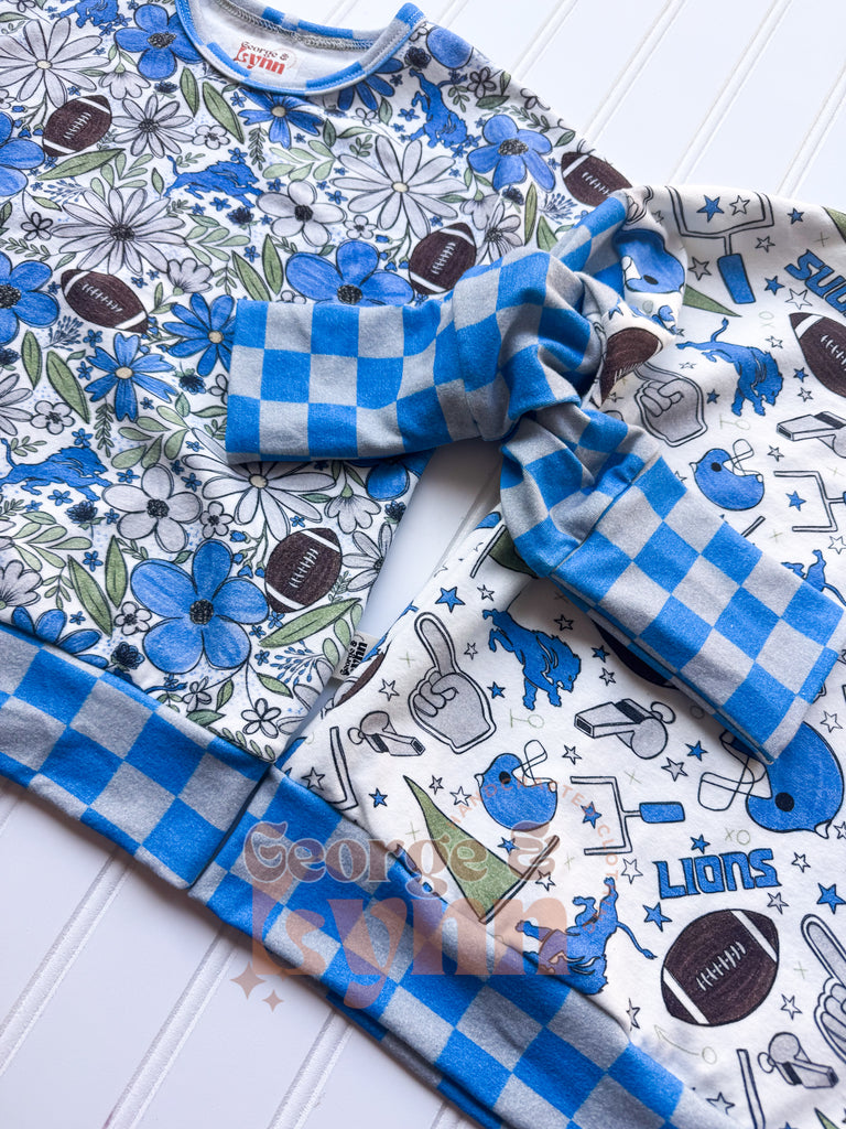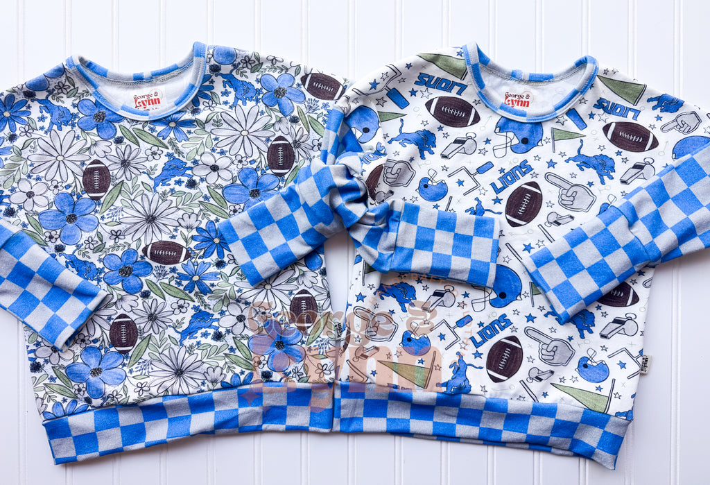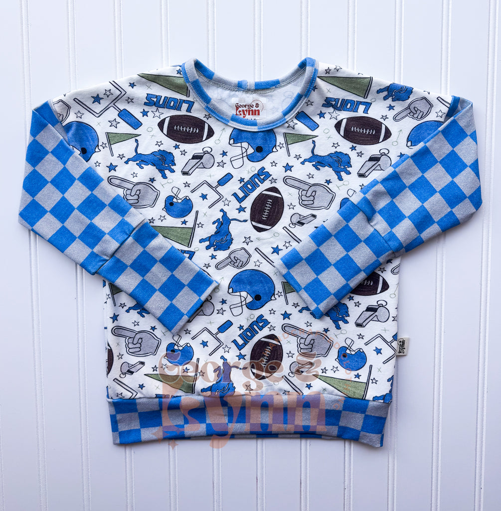 Celebrate football season with this bold Detroit-inspired Dolman! Featuring a boys’ football print with coordinating checker sleeves and cuff trim, this style is as fun as it is practical. Made with soft cotton spandex for breathable comfort and stretch.
