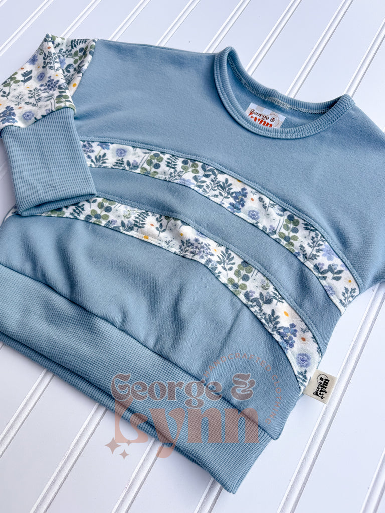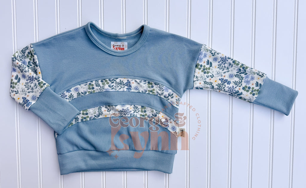 This Rainbow Dolman is full of charm and comfort! Featuring a unique rainbow-inspired colorblock design, it pairs a soft solid blue with a delicate floral print for a playful yet timeless look. Made with cozy American-milled French terry, it’s breathable, durable, and designed to grow with your child through multiple sizes.